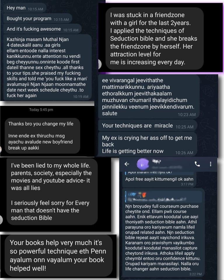 32 രാജ്യങ്ങളിൽ നിന്നുള്ള ആയിരക്കണക്കിന് മലയാളികളായ പുരുഷന്മാർ 'The Seduction Bible' വഴി തങ്ങളുടെ ഉള്ളിലെ ആത്മവിശ്വാസമുള്ള, ആകർഷണീയതയുള്ള ഉയർന്നമൂല്യമുള്ള പുരുഷനെ വീണ്ടെടുത്തു കഴിഞ്ഞു. സുന്ദരികളായ, സ്ത്രീത്വമുള്ള (Feminine) പങ്കാളികളെ കണ്ടെത്താനും മികച്ച ബന്ധങ്ങൾ കെട്ടിപ്പടുക്കാനും അവരോടൊപ്പം കിടക്കാനും അവർക്കിന്ന് സാധിക്കുന്നു.